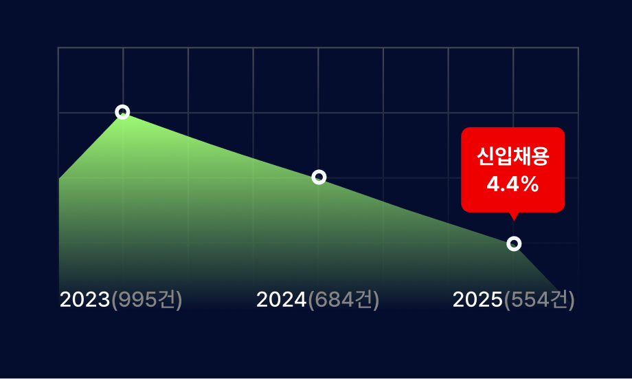 IT 채용에서 신입 비중, 단 4.4%. IT 업계 채용 100명 중 신입 채용은 4-5명 수준 출처: 진학사 캐치